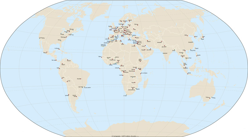 Il est bien loin, le temps où l'idée de franchir une cinquantaine de kilomètres empêchait de dormir, où l'on choisissait son conjoint dans l'environnement immédiat et où l'univers se limitait à son village et à ceux circonvoisins... Les Brasseur d'aujourd'hui sont bien de leur temps, de notre temps, et vivent dans le «village planétaire». Et si le Nord a toujours ses fidèles, certains sont partis plus au sud, certains plus à l'ouest, d'autres enfin ont franchi des frontières lointaines, des mers, des continents ! Des descendants Brasseur vivent en Espagne ou en Angleterre, c'est devenu banal, d'autres sont partis (pour toujours ?) au Canada, et d'autres encore reviendront du Japon, ou de Bogota, qui sait... Le principe de cette page actuellement encore en préparation sera de faire apparaitre sur cette planisphère l'éparpillement de la famille en en montrant les diverses localisations par région, voire plus largement lorsque ce sera nécessaire. |