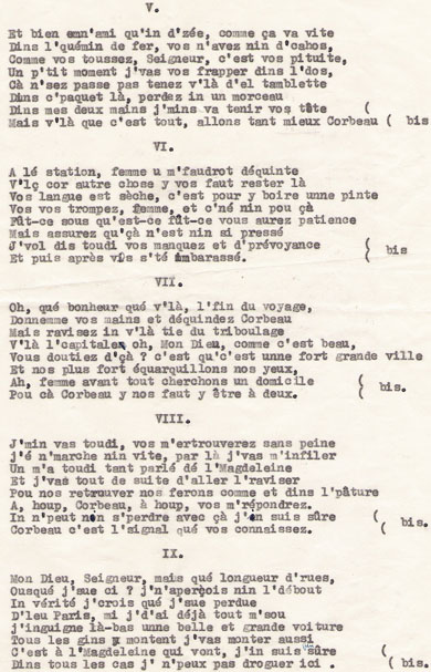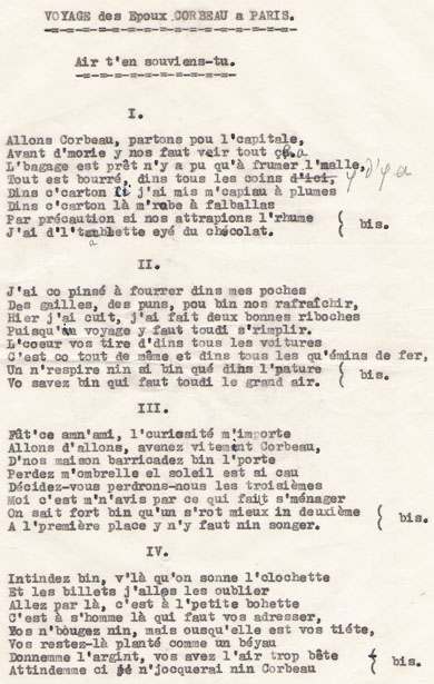 Qui nous dira quel fut l'auteur de cette fantaisie et de quand elle date ? Ou encore de quand date ce fameux voyage des époux Corbeau à Paris ? Voici en tout cas ce texte, considéré comme l'hymne national des Corbeau qu'il faut, parait-il, chanter sur l'air de «T'en souviens-tu»...