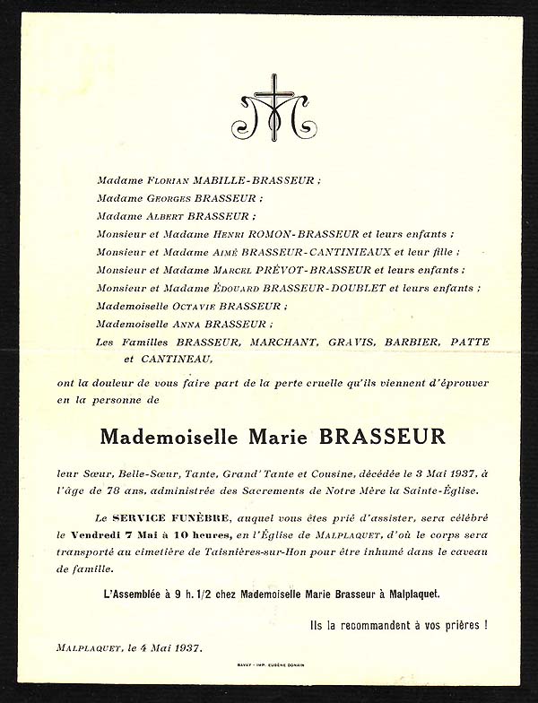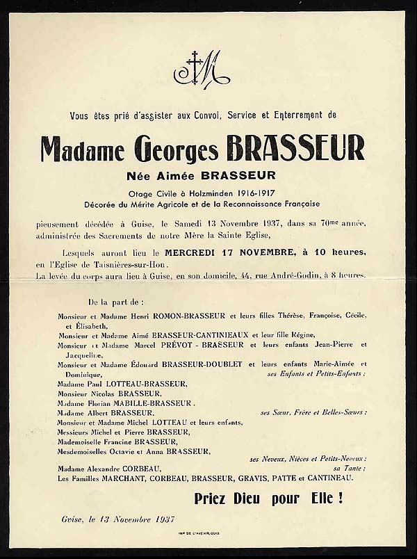 1883 : Alphonse Marchant 1890 : Jules Etienne de la Gorce, époux de Delphine Quivy 1890 : François Marchant, époux d'Aimée Brasseur 1891 : Louis Gaston Corbeau, nourrisson 1898 : Edouard Brasseur 1, maire de Taisnières 1903 : Elvire Brasseur Corbeau 1903 : Aimée Marchant Brasseur 1905 : Alexandre Corbeau, époux d'Elise Marchant 1905 : Lucie Gravis Brasseur 1907 : Edouard Lotteau 1907 : Anna Brasseur 1908 : Aimé Joseph Brasseur 1910 : Charles Eugène Cheval 1911 : Gaston Corbeau, époux de Laure Caulier 1912 : Georges Brasseur 1914 : Albert Brasseur 1922 : Aline Marchant Léquipar 1923 : Alfred Fournier 1927 : Octavie Brasseur 1928 : Emilie Quivy Fourchault 1928 : Louis Corbeau 1929 : Lucy Brasseur Duchange 1931 : Henri Gravis 1933 : Paul Lotteau 1933 : Marie Aimée Cheval 1937 : Marie Brasseur 1937 : Aimée Brasseur 1938 : Elise Corbeau Marchant 1938 : Henri Germe 1942 : Sophie Cheval Marchant 1943 : Gaston Corbeau, époux de Juliette Vanderborght 1943 : Nicolas 6 Brasseur |