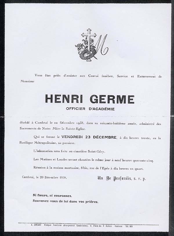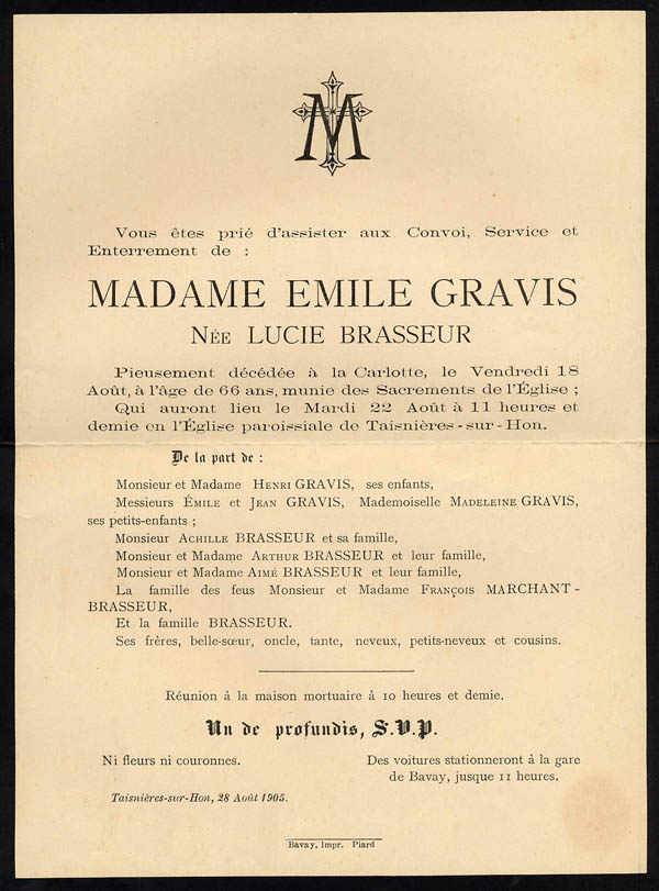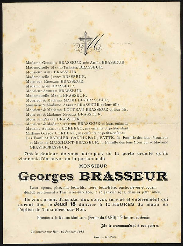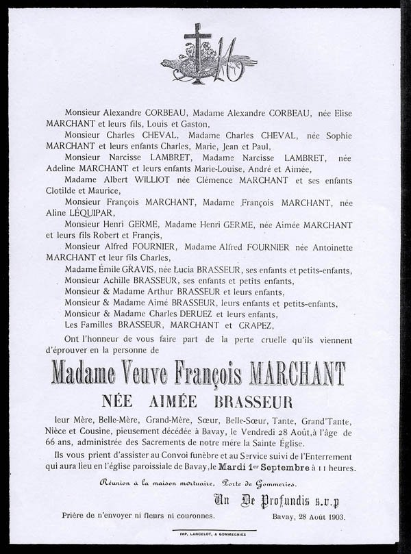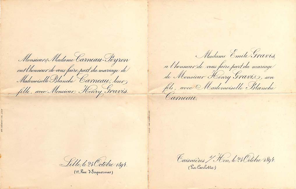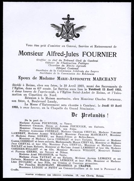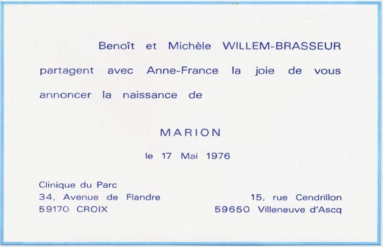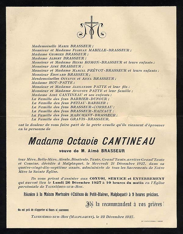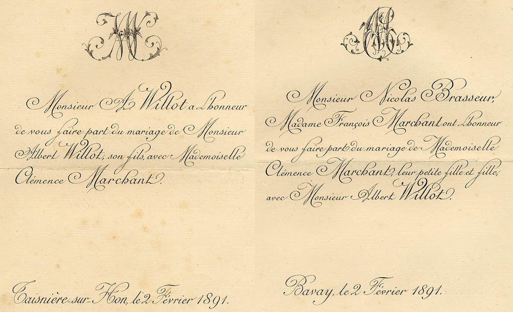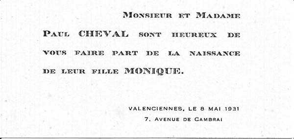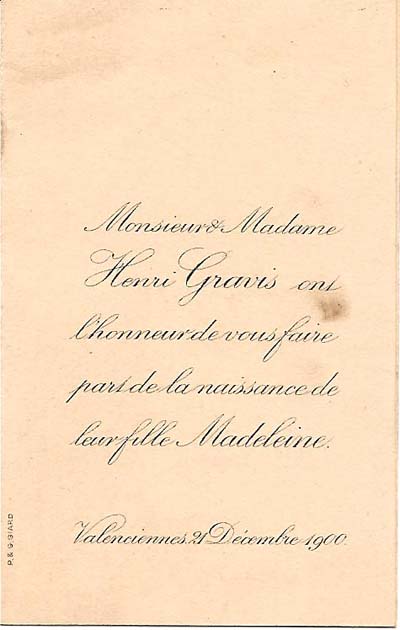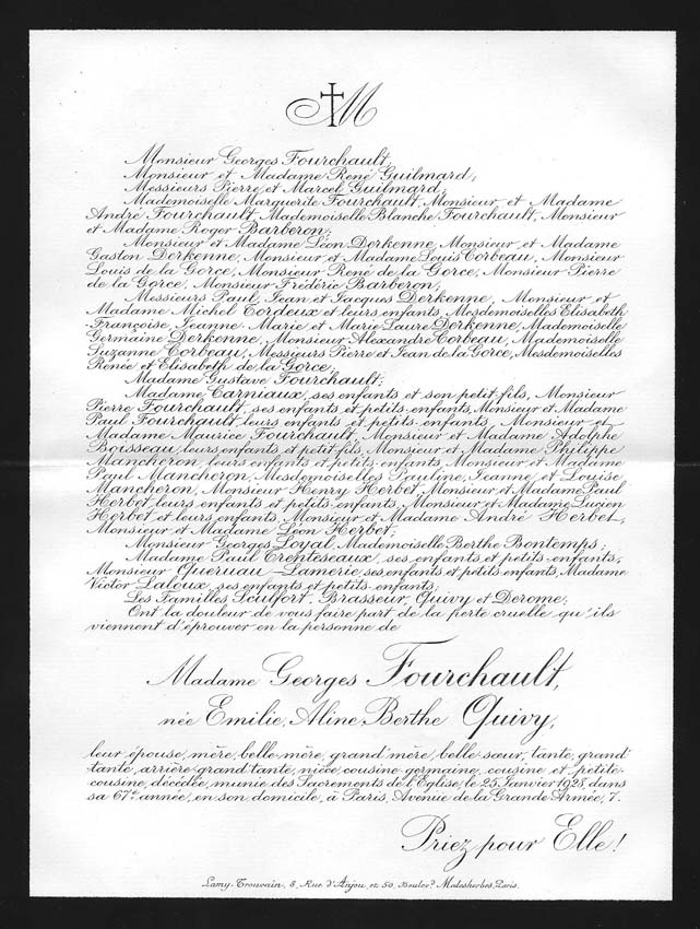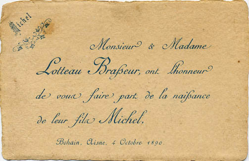 Nous avons placé dans le premier chapitre de la rubrique « Documents » des textes écrits pour la famille et pour des circonstances précises ou déterminées. Mais il y a beaucoup d'autres documents dans les papiers familiaux, à commencer par ce qu'on a l'habitude d'appeler les petits papiers. On regroupe sous ce nom des choses en vrac, avec quand même une prédilection pour tous ces papiers chargés d'annoncer les événements de la vie : les faire-parts. Cette rubrique va donc regrouper tous ceux que nous avons pu collecter jusqu'à présent. Naturellement, vous pouvez toujours proposer des ajouts ou nous suggérer d'autres idées dans ce domaine.