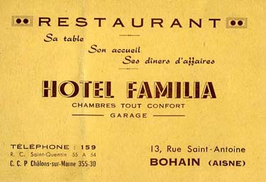 En 1955, Edouard et Marie-Charlotte Brasseur décident d'arrêter la quincaillerie et de changer de métier. Ils créent juste à côté un hôtel auquel ils donnent le nom de "Hôtel Familia", établissement qu'ils vont tenir une dizaine d'années avant de cesser toute activité en 1965, l'état de santé d'Edouard devenant précaire... |