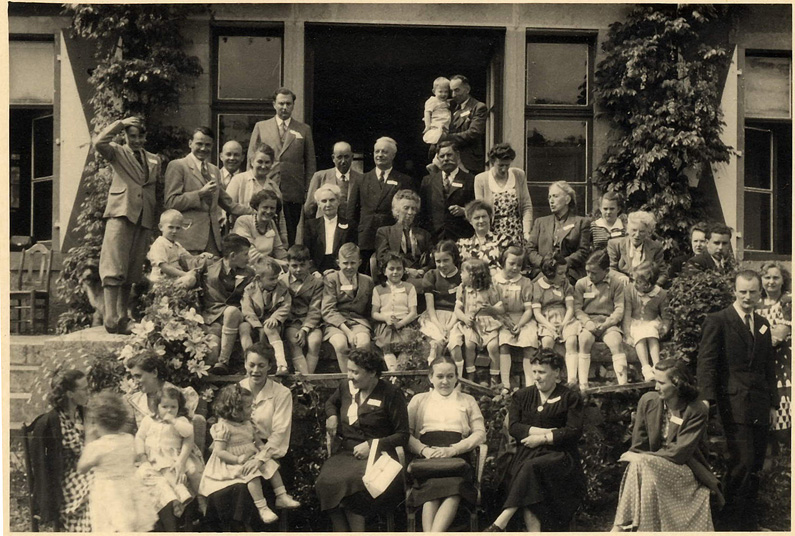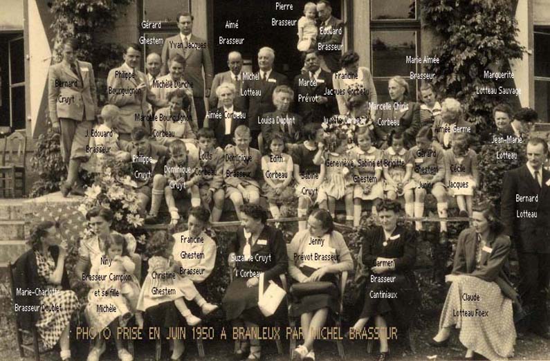 RÉUNIONS ELARGIES A partir de la fin de la guerre puis dans les années cinquante, des initiatives se prennent pour provoquer des réunions plus larges de la famille. C'est le cas ci dessous avec cette belle photo prise à la Pentecote 1950 sur les terrasses de Branleux, immortalisant une réunion de la famille Corbeau, faite à l'initiative de Marcelle Bourguignon et à laquelle elle avait convié des cousins Brasseur. |