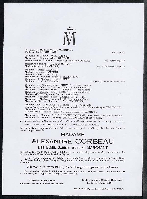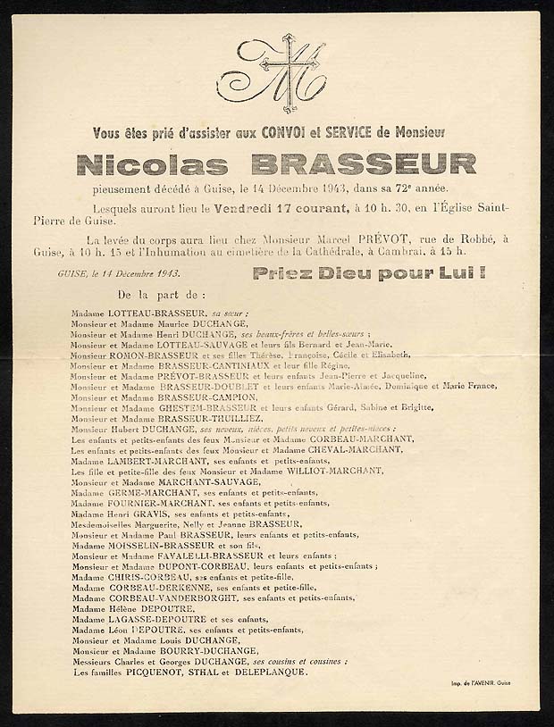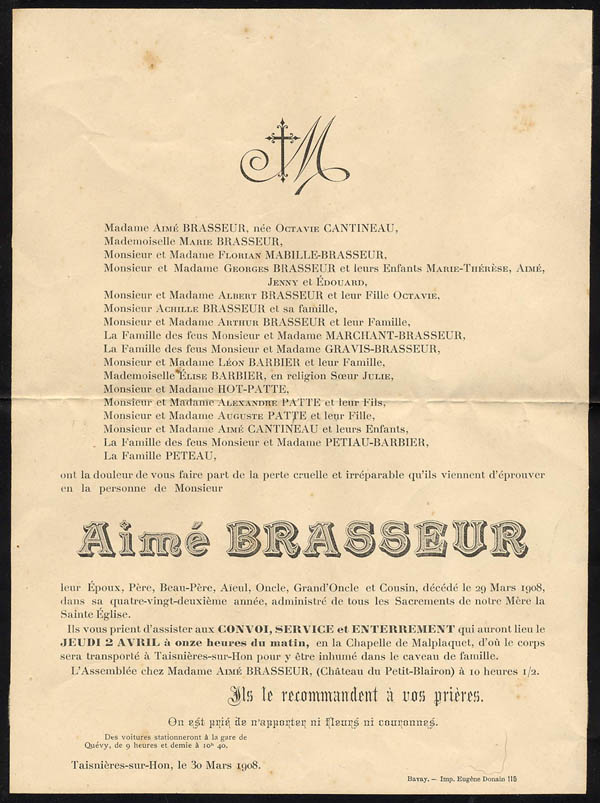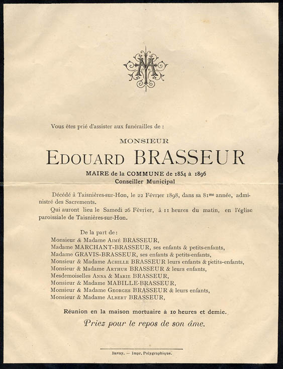 1883 : Alphonse Marchant 1890 : Jules Etienne de la Gorce, époux de Delphine Quivy 1890 : François Marchant, époux d'Aimée Brasseur 1891 : Louis Gaston Corbeau, nourrisson 1898 : Edouard Brasseur 1, maire de Taisnières 1903 : Elvire Brasseur Corbeau 1903 : Aimée Marchant Brasseur 1905 : Alexandre Corbeau, époux d'Elise Marchant 1905 : Lucie Gravis Brasseur 1907 : Edouard Lotteau 1907 : Anna Brasseur 1908 : Aimé Joseph Brasseur 1910 : Charles Eugène Cheval 1911 : Gaston Corbeau, époux de Laure Caulier 1912 : Georges Brasseur 1914 : Albert Brasseur 1922 : Aline Marchant Léquipar 1923 : Alfred Fournier 1927 : Octavie Brasseur 1928 : Emilie Quivy Fourchault 1928 : Louis Corbeau 1929 : Lucy Brasseur Duchange 1931 : Henri Gravis 1933 : Paul Lotteau 1933 : Marie Aimée Cheval 1937 : Marie Brasseur 1937 : Aimée Brasseur 1938 : Elise Corbeau Marchant 1938 : Henri Germe 1942 : Sophie Cheval Marchant 1943 : Gaston Corbeau, époux de Juliette Vanderborght 1943 : Nicolas 6 Brasseur |