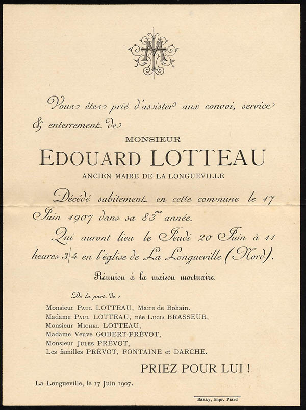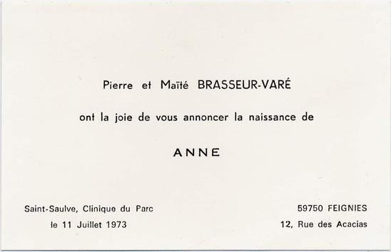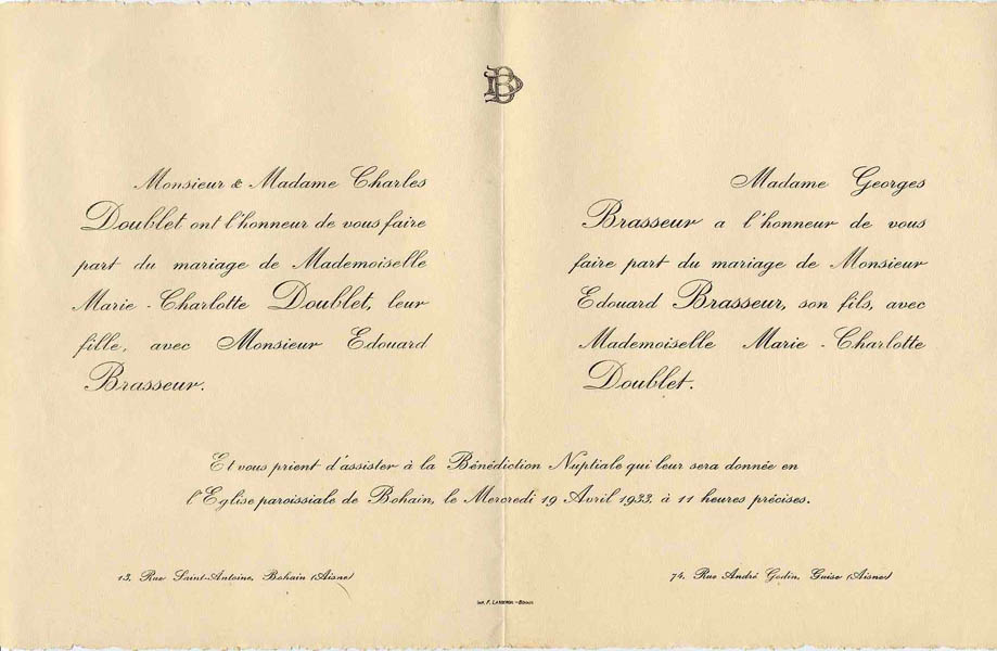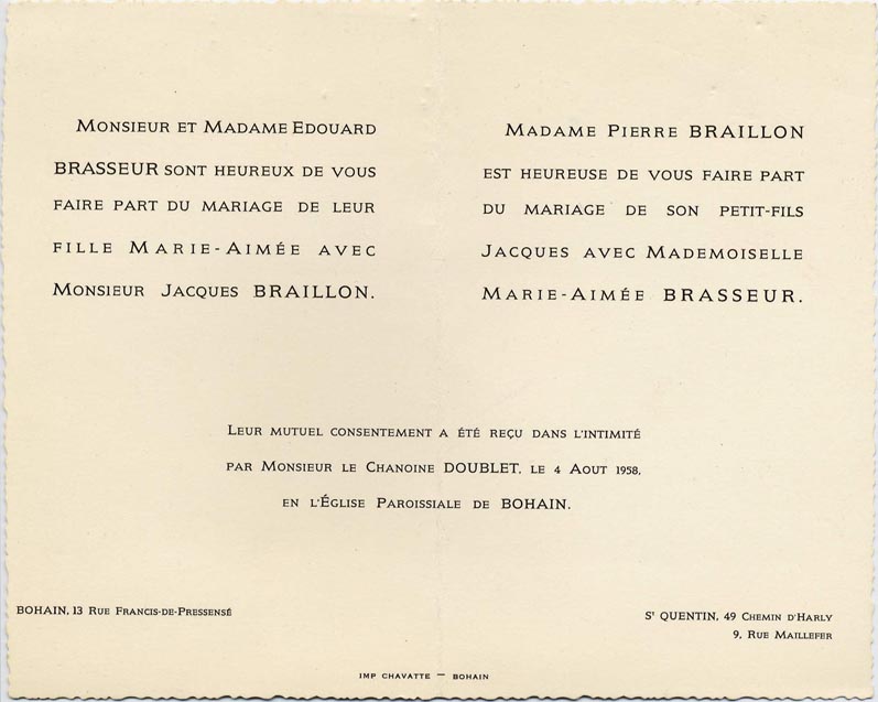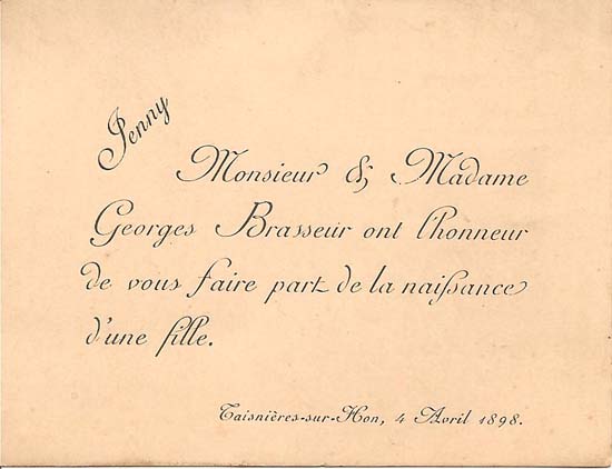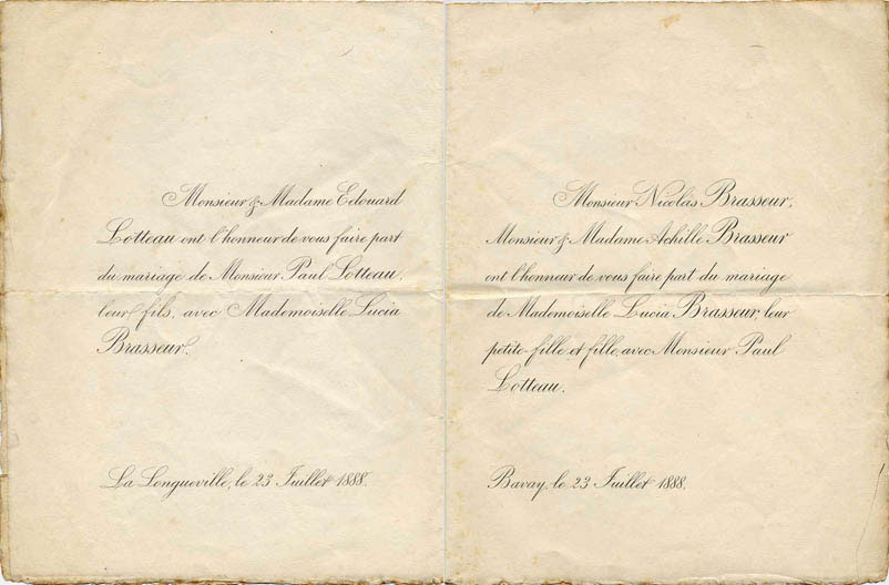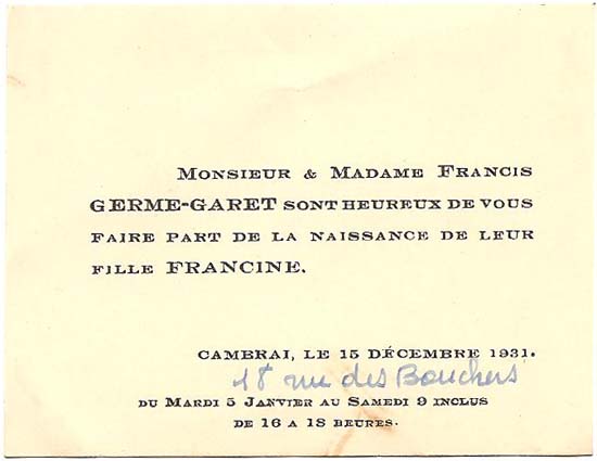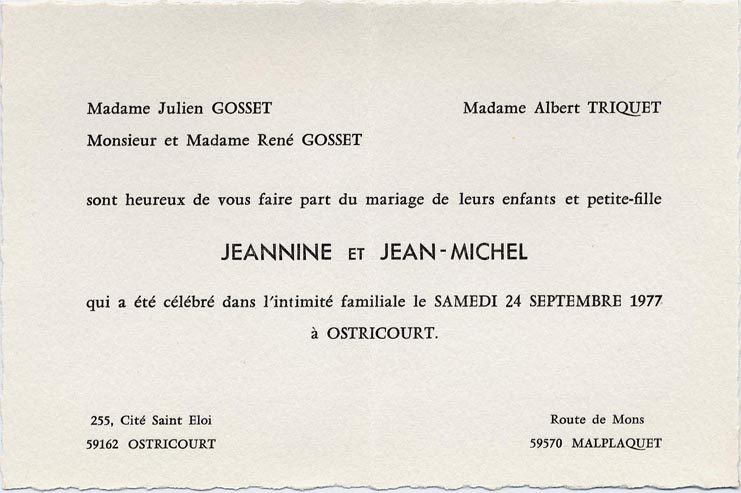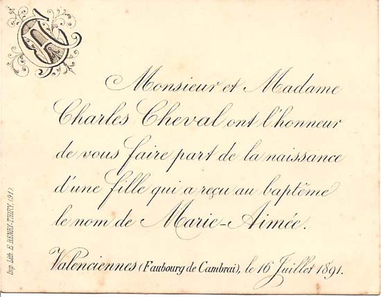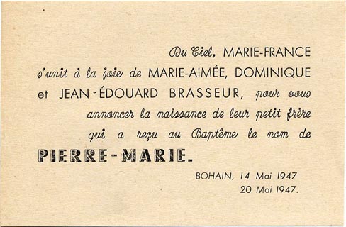 Nous avons placé dans le premier chapitre de la rubrique « Documents » des textes écrits pour la famille et pour des circonstances précises ou déterminées. Mais il y a beaucoup d'autres documents dans les papiers familiaux, à commencer par ce qu'on a l'habitude d'appeler les petits papiers. On regroupe sous ce nom des choses en vrac, avec quand même une prédilection pour tous ces papiers chargés d'annoncer les événements de la vie : les faire-parts. Cette rubrique va donc regrouper tous ceux que nous avons pu collecter jusqu'à présent. Naturellement, vous pouvez toujours proposer des ajouts ou nous suggérer d'autres idées dans ce domaine.