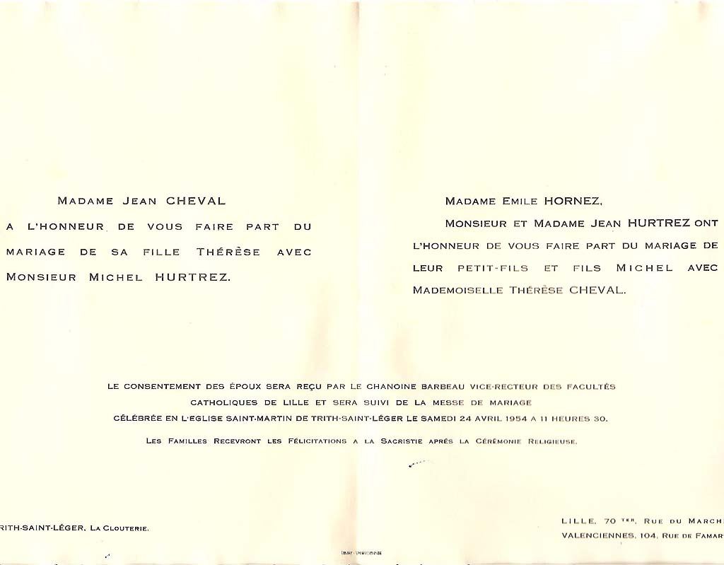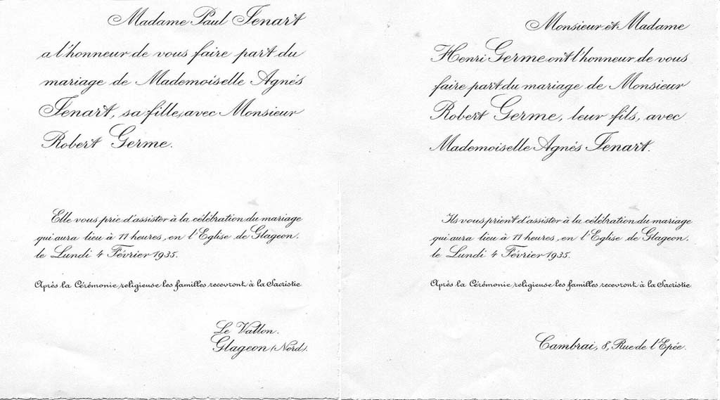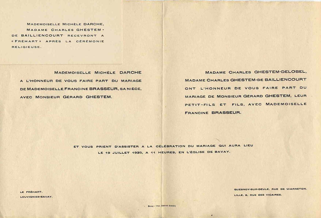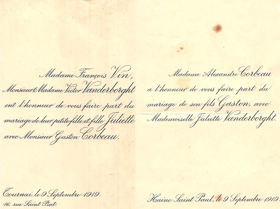 1888 : Paul Lotteau et Lucia Brasseur 1891 : Albert Williot et Clémence Marchant 1894 : Henri Gravis et Blanche Carneau 1919 : Gaston Corbeau et Juliette Vanderborght 1923 : Francis Germe et Simone Garet 1925 : Paul Cheval et Thérèse Hayez 1933 : Jean Gravis et Marguerite Scrive 1933 : William Cruyt et Suzanne Corbeau 1933 : Edouard Brasseur 2 et Marie-Charlotte Doublet 1934 : Joseph Lefebvre et Renée de La Gorce 1935 : Robert Germe et Agnès Jenart 1938 : Gérard Ghestem et Francine Brasseur 1954 : Michel Hurtrez et Thérèse Cheval 1954 : Paul Grenez et Monique Cheval 1958 : Jacques Braillon et Marie-Aimée Brasseur 1977 : Jean-Michel Triquet et Jeannine Gosset