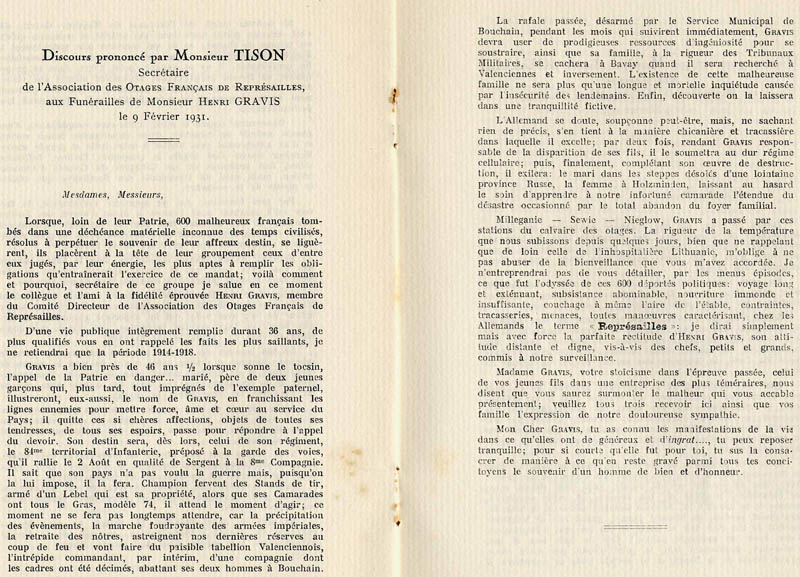 La paix est revenue, mais le souvenir va être extraordinairement vivace dans les familles qui restent cependant discrètes sur le sujet. Ainsi, ce n'est qu'au moment des obsèques de Henri Gravis en 1931 que nous avons un court témoignage sur l'épreuve qu'il a vécu...